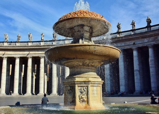 Hay dos grandes fuentes gemelas (me gusta la paridad),  a cada lado de la plaza diseñadas por Bernini, como símbolo del mandato sagrado de «dar de beber al sediento»!, y alineadas con el obelisco, tras cada una de ellas la columnata de Bernini como un abanico de estilizadas columnas coronadas con diferentes esculturas en mármolen semicírculo que limita la plaza.