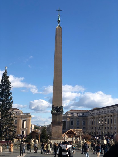 Esta pieza legendaria, tiene un significado muy especial y es por eso que ocupa el centro de esta plaza, … pues fue testigo mudo de la crucifixión del apóstol Pedro, que tuvo lugar muy cerca de aquí, en el gran circo de Nerón, donde adornaba la espina central de la pista. AllílosCristianos fueron torturados y sacrificados, acusados de aquel infame incendio que devoró a Roma en el año 64.