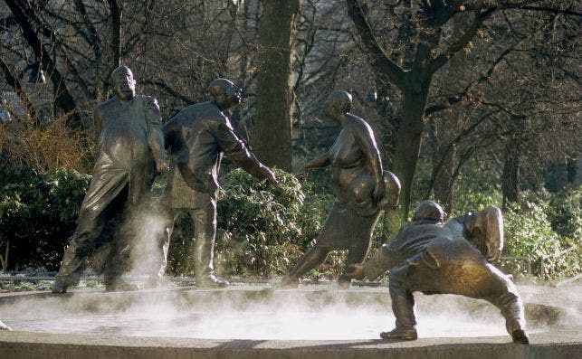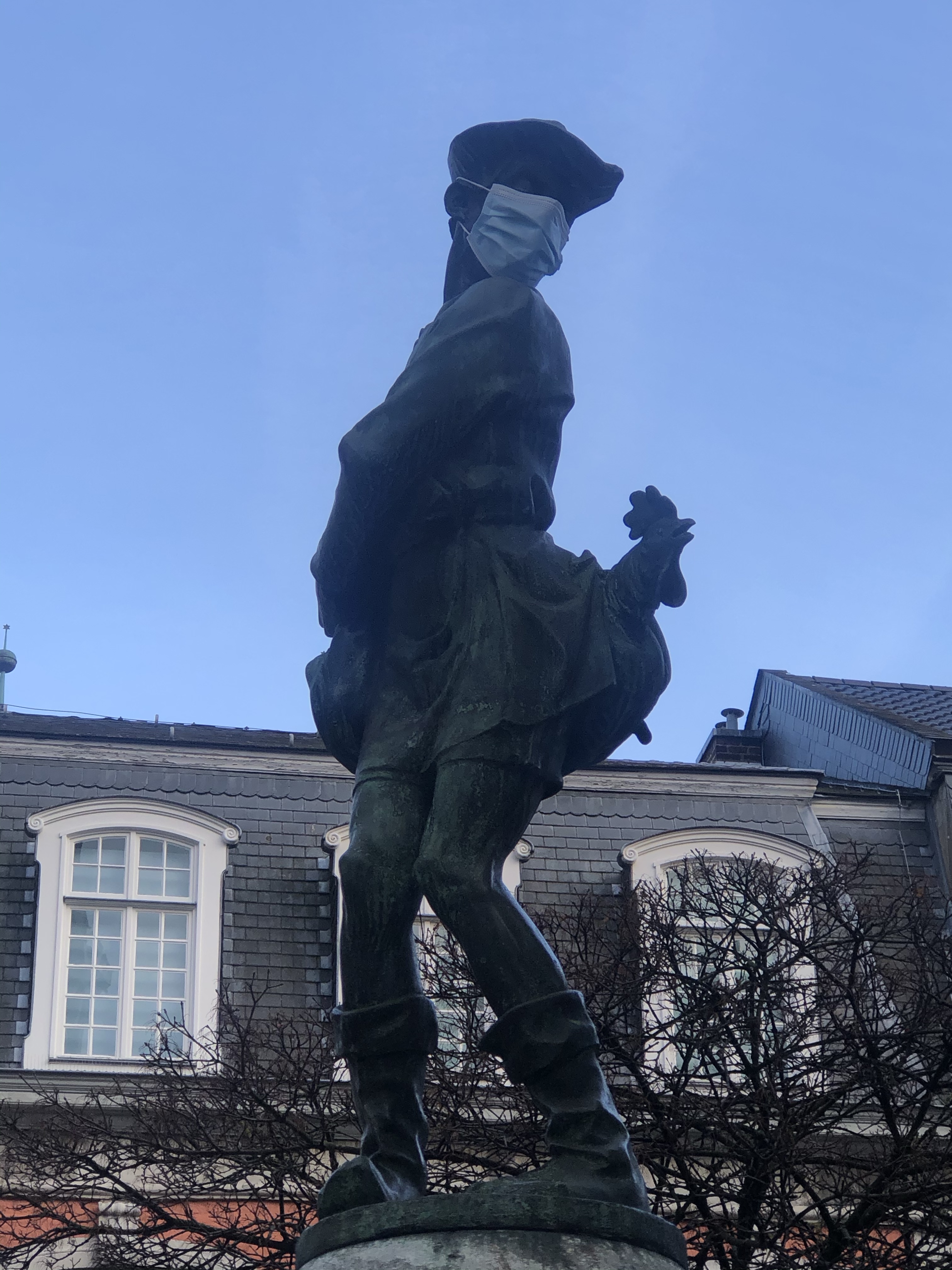 Esta fuente como todo en esta ciudad, tiene su propia historia, pues se trata de un niño que fue atrapado robando gallinas después de una gran aventura. Es una fuente muy simpática. Pero lo que me llamo la atención fue la mascarilla que le han puesto a la escultura para ponernos en contexto!. Pues a propósito de la pandemia, todas las fuentes de esta ciudad están secas.