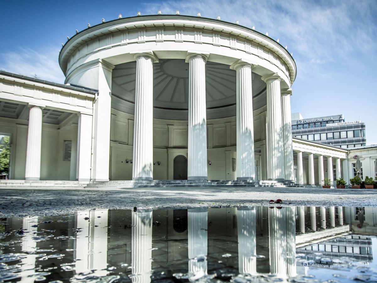 Por último, la de Elisenbrunnen. El edificio tiene una columnata de estilo dórico para recibir a los visitantes y dos fuentes de donde fluye el agua sulfurada con cualidades curativas.
