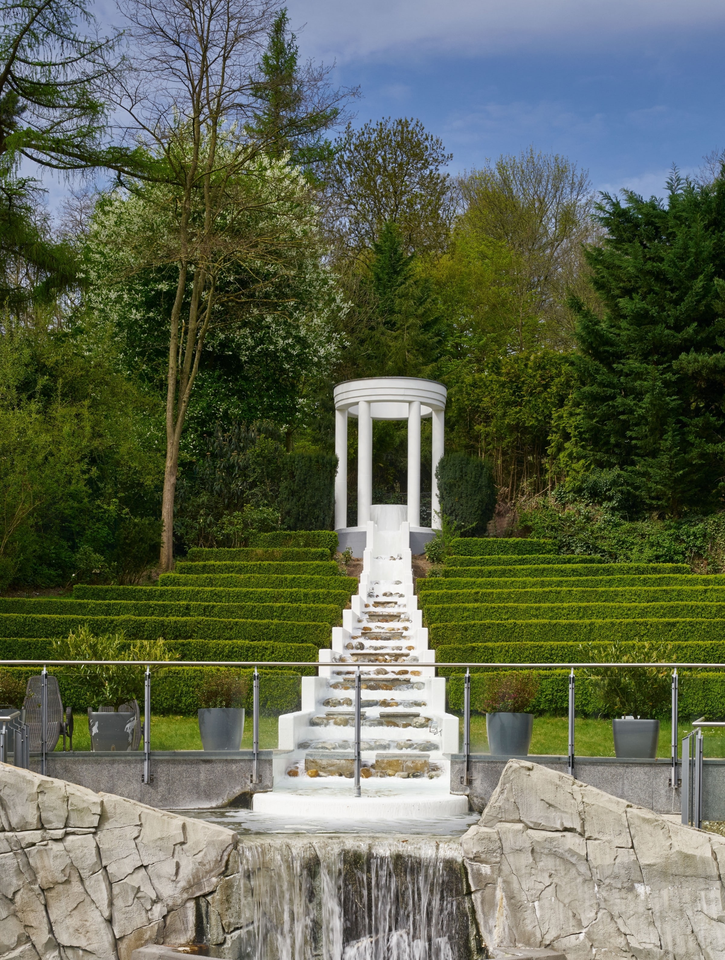Desde allí se observa el palacio en toda su dimensión, entre esculturas bellísimas de sobresalientes artistas de la época, algunas fuentes que refrescan el lugar, árboles legendarios, áreas verdes cuidadosamente trabajadas como formando bellos laberintos.