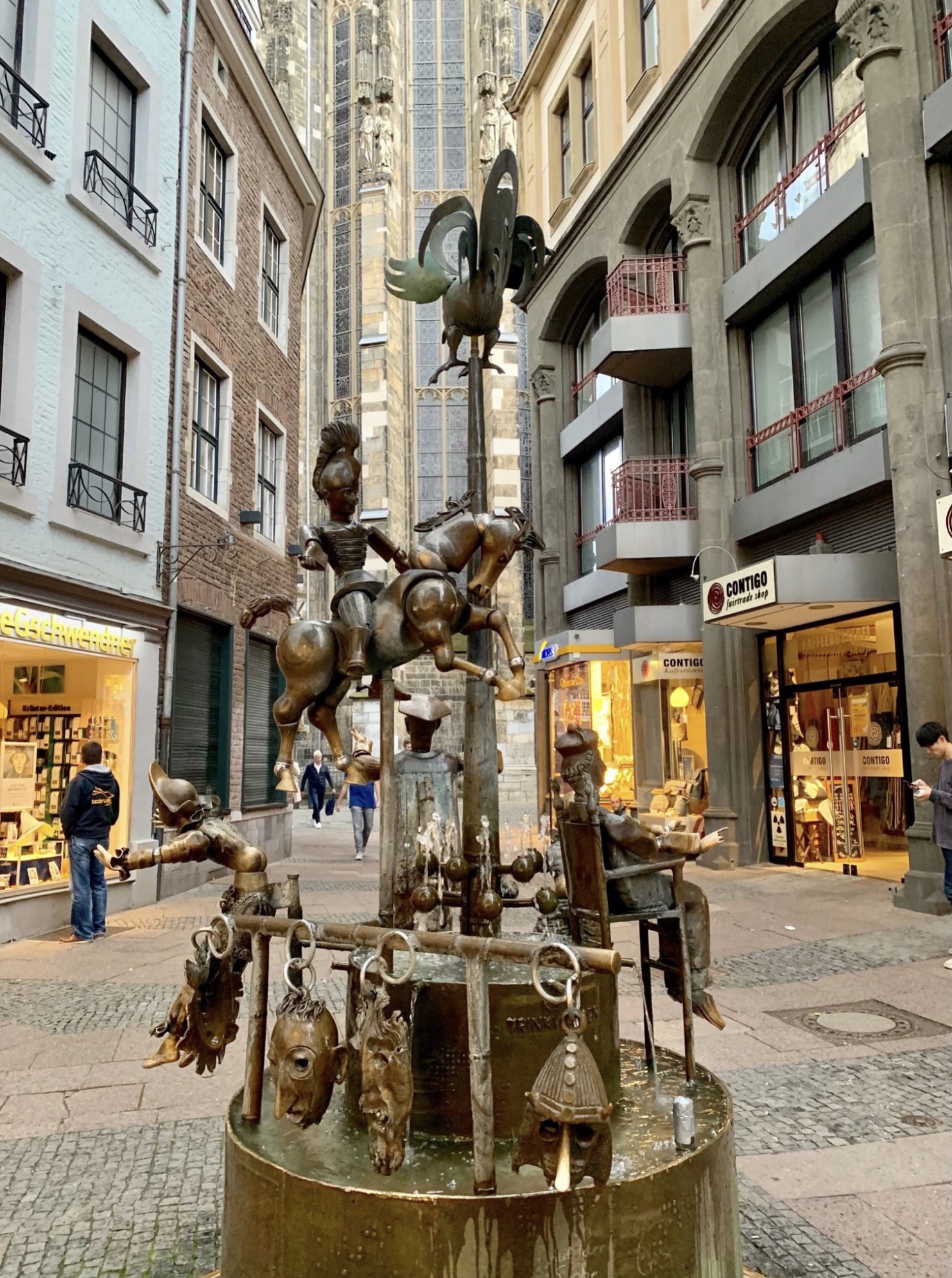 Es una fuente absolutamente espectacular!, la conforman muñecos, completamente articulados en bronce, que puedes mover y jugar a tu antojo, … mientras el agua fluye entre ellos, cada muñeco cuenta su propia historia, y representan muchos de los principales eventos y tradiciones de la ciudad como el carnaval, la equitación, la industria textil, la ciencia, la universidad,…personajes y símbolos que forman parte de su historia, como el emperador Carlomagno etc. Es una gran fuente temática!. Súper linda!…