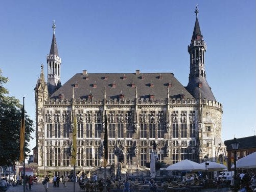 Pasemos ahora al ayuntamiento, que está muy cerca de la catedral, y es otra edificación impresionante. Está construido sobre las ruinas del palacio de Carlomagno y se considera como una obra maestra de la arquitectura gótica y barroca de Aquisgran.